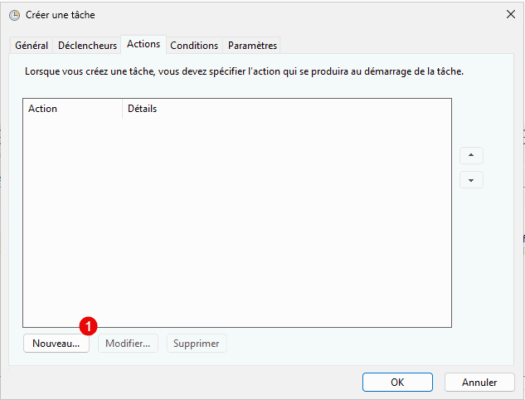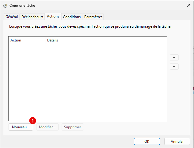 Wechseln Sie zur Registerkarte „Aktionen“. Hier konfigurieren wir die Ausführung des PowerShell-Skripts. Klicken Sie dazu auf die Schaltfläche „Neu 1“.