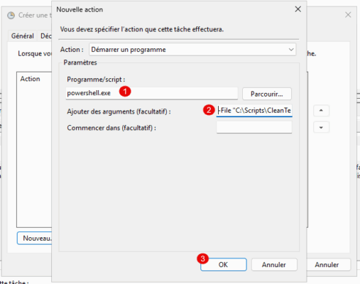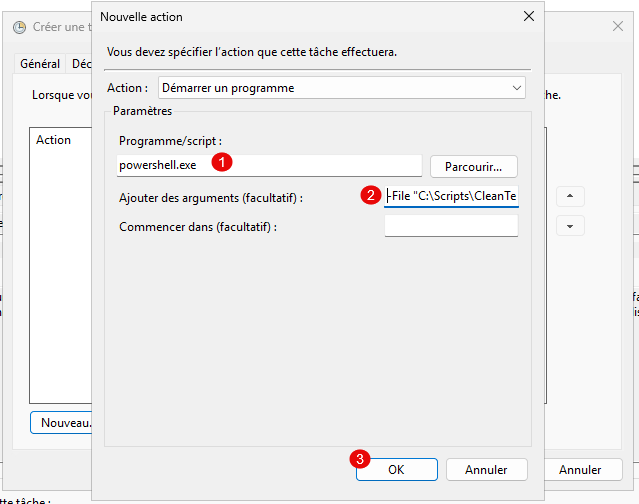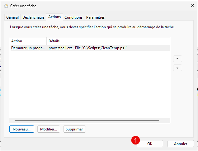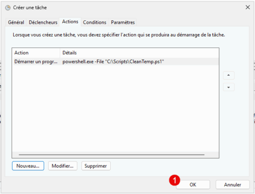 Die Aktion, die die Ausführung des Skripts ermöglicht, wird hinzugefügt. Klicken Sie auf OK 1, um die geplante Aufgabe zu erstellen.