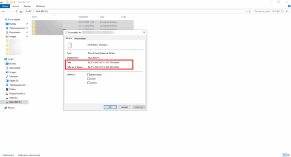 En comparant avec Veeam, qui indique l’espace utilisé par les sauvegardes, il y a une différence de quasiment 20To, après analyse des propriétés des dossiers sur le disque, l’espace utiliser est de 59.4 To.