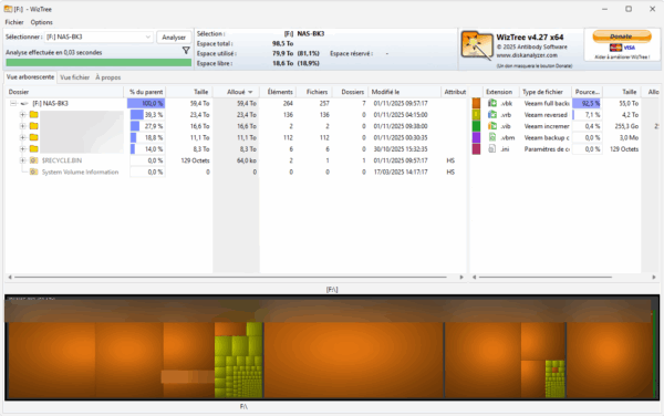 Dans le doute, j’utilise WizTree pour analyser le disque, afin de voir s’il n’y a pas des fichiers cachés, de la déduplication .., comme on peut le voir, j’ai le même résultat.