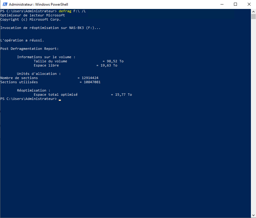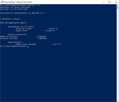 Une fois la commande terminée, l’espace optimisé est affiché, comment on peut le voir 15.77 To dans mon cas.