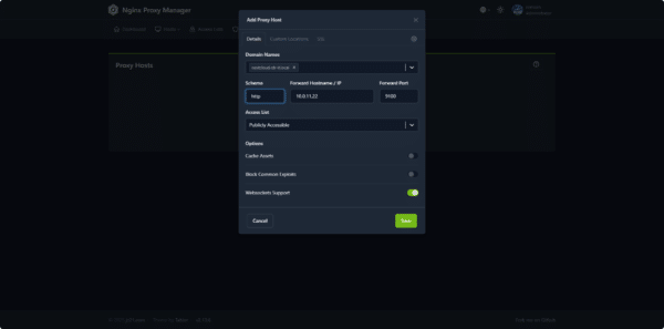 Pour ce tutoriel, j’ai utilisé Nginx Proxy Manager (NPM), la configuration est assez simple, vous devez juste avec le support des Websockets pour Nextcloud et OnlyOffice.