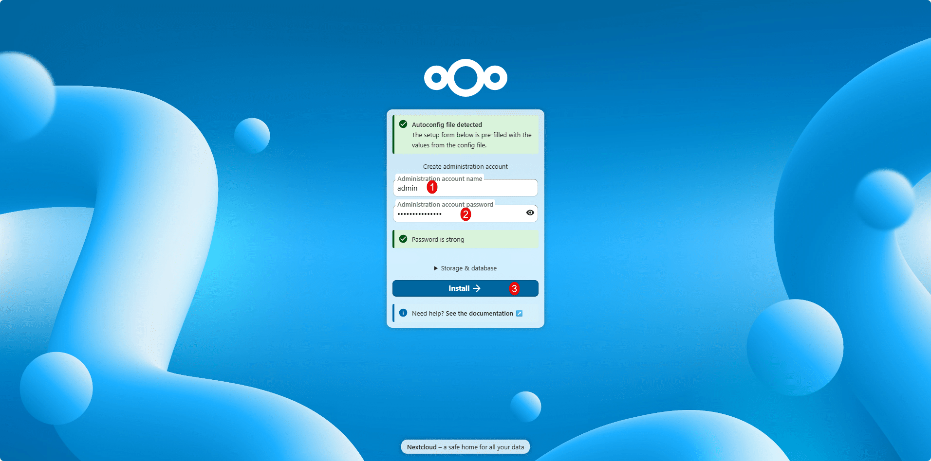 Maintenant que tout est prêt : configuration, conteneurs et reverse proxy, nous allons passer à l’installation de Nextcloud. Cette étape va créer la base de données et nous permettre de configurer le compte administrateur.