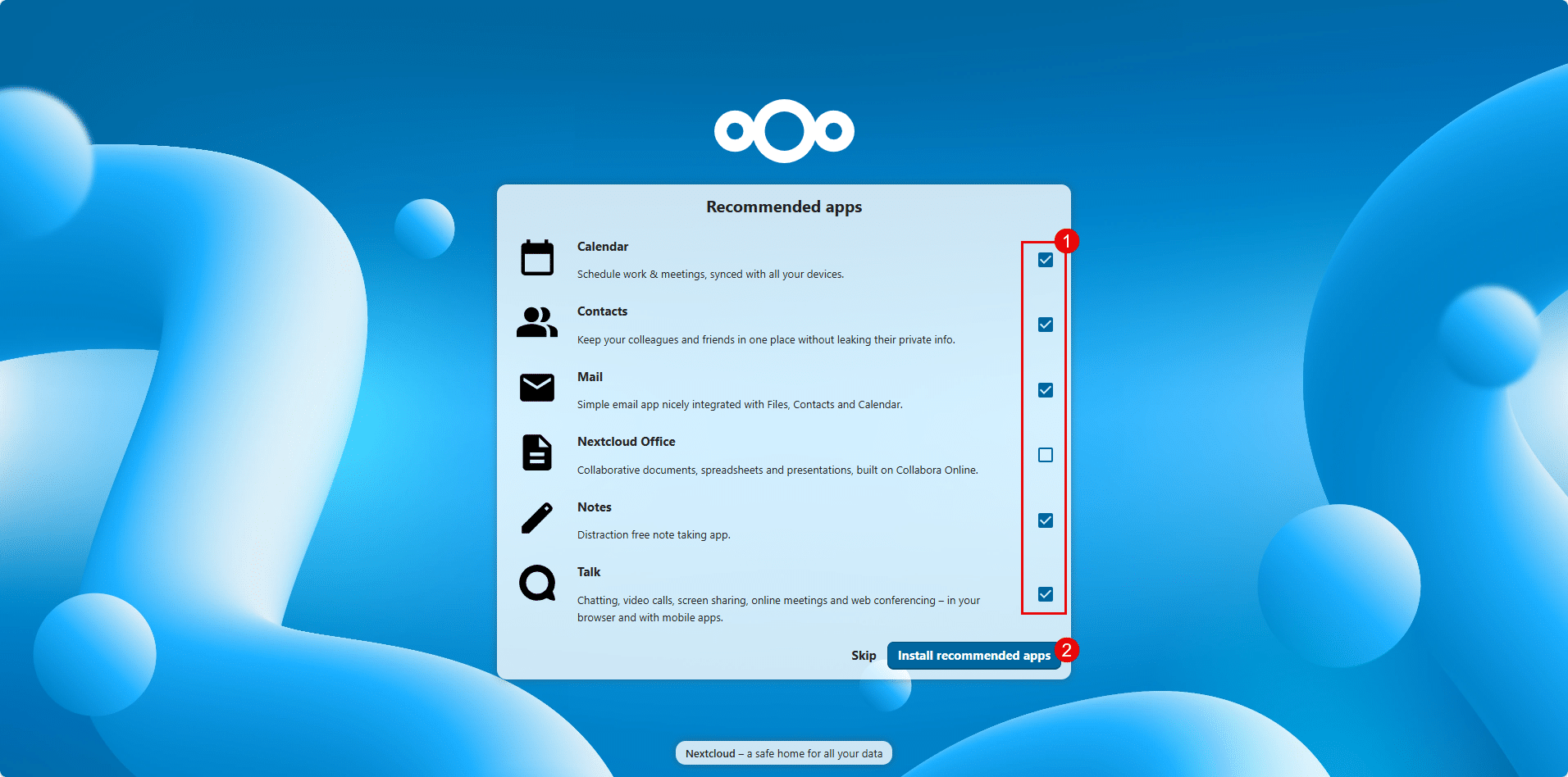 Ensuite l’assistant, vous propose d’installer les applications les plus « utilisés », à vous de voir ce que vous souhaitez, par contre l’application : Nextcloud Office, ne doit pas être installé car nous allons par la suite configurer OnlyOffice. Choisir les applications 1 puis cliquer sur Install recommended apps 2.