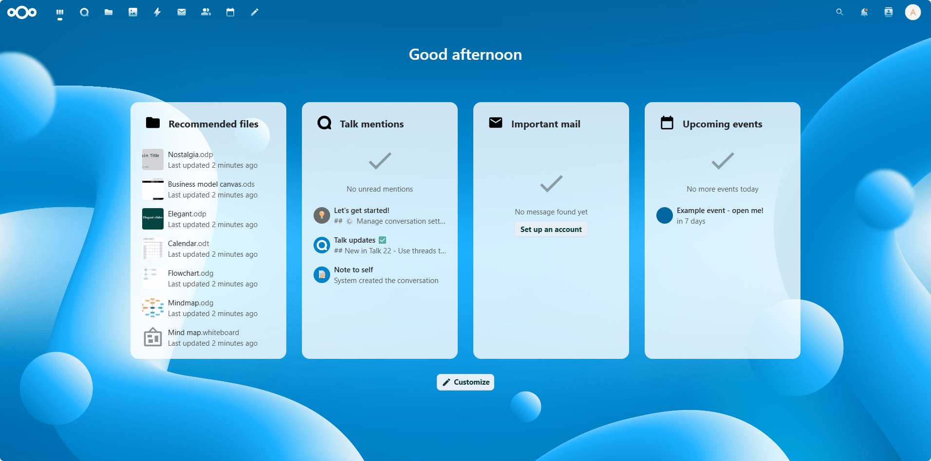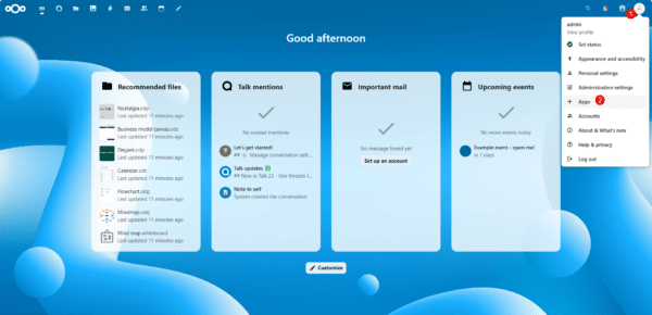 Fermer les différents message qui s’affiche, on arrive ensuite sur la page d’accueil de Nextcloud.