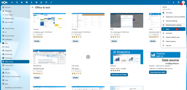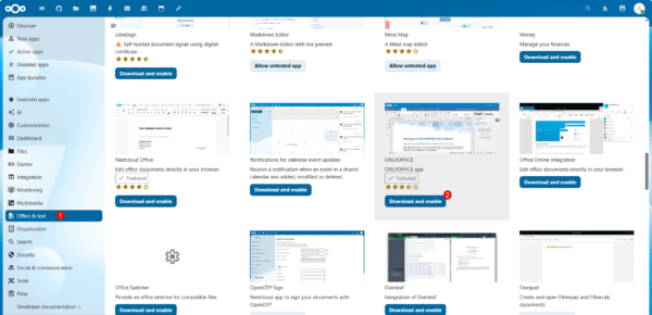 Aller dans la catégorie Office & text 1, rechercher l’application ONLYOFFICE puis cliquer le bouton Download and enable 2 pour installer l’application dans Nextcloud.
