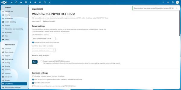 Une notification s’affiche en haut à droite indiquant que le serveur OnlyOffice est bien configuré.