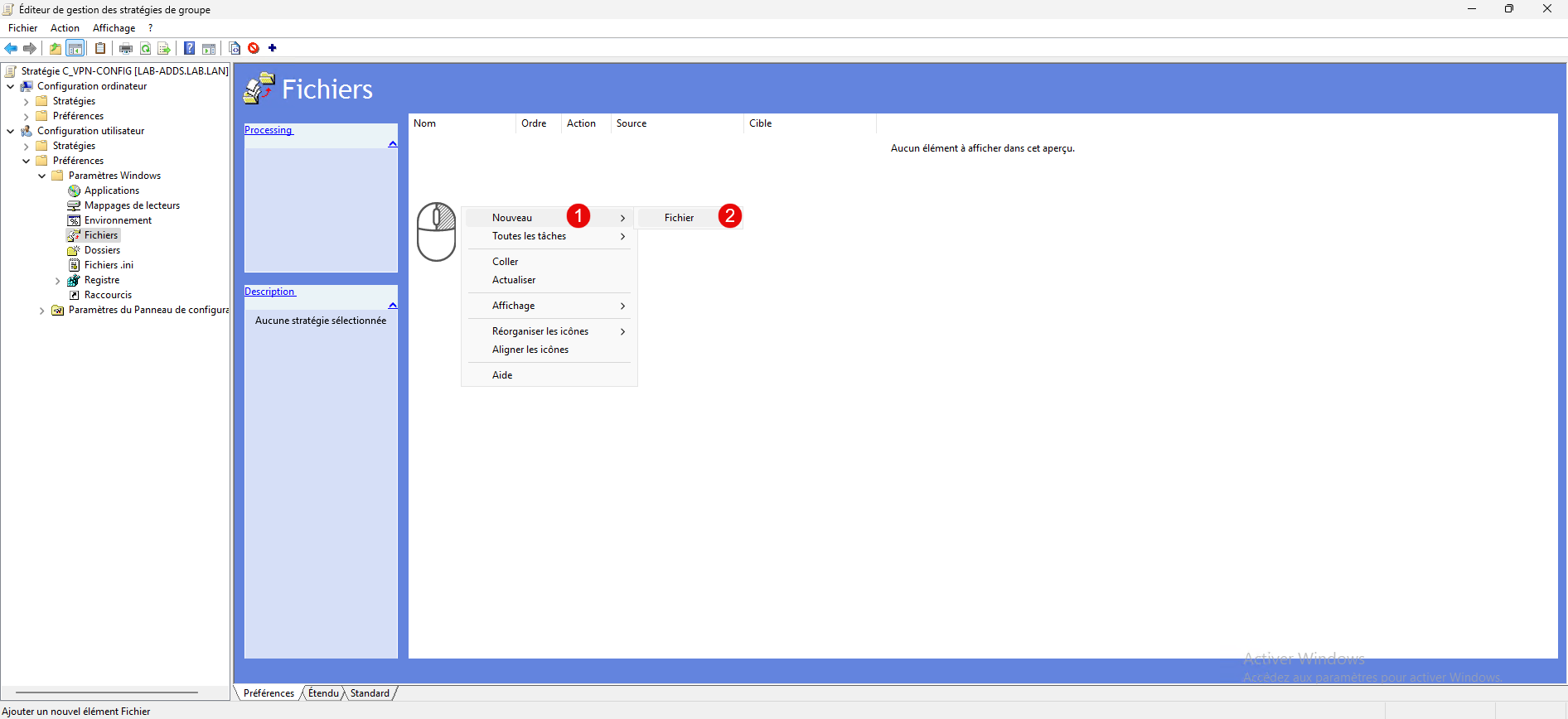 Ensuite depuis l’éditeur de stratégie de groupe, aller à l’emplacement suivant : Configuration utilisateur / Préférences / Paramètres Windows / Fichiers, faire un clic droit dans la zone centrale, aller sur Nouveau 1 et cliquer sur Fichier 2.