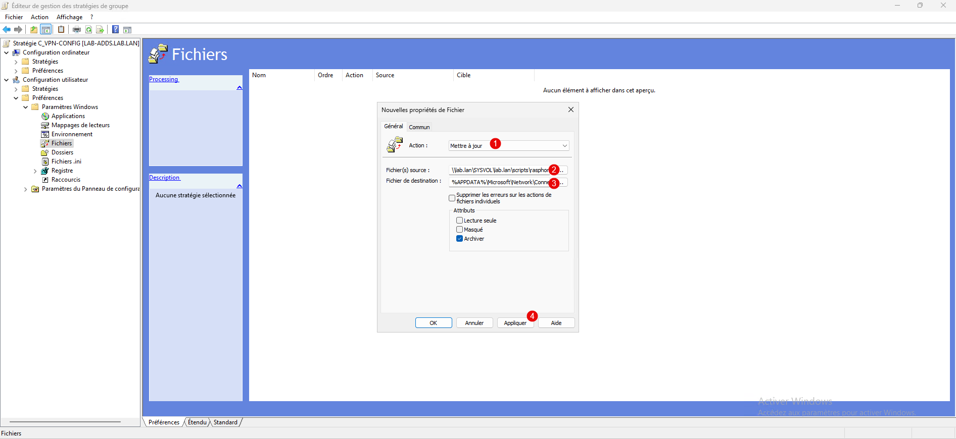 Choisir l’Action : Mettre à jour 1, Fichier source mettre le chemin UNC du fichier rasphone.pbk 2, fichier de destination : %appdata%\Microsoft\Network\Connections\Pbk\rasphone.pbk 3 puis cliquer sur le bouton Appliquer 4.