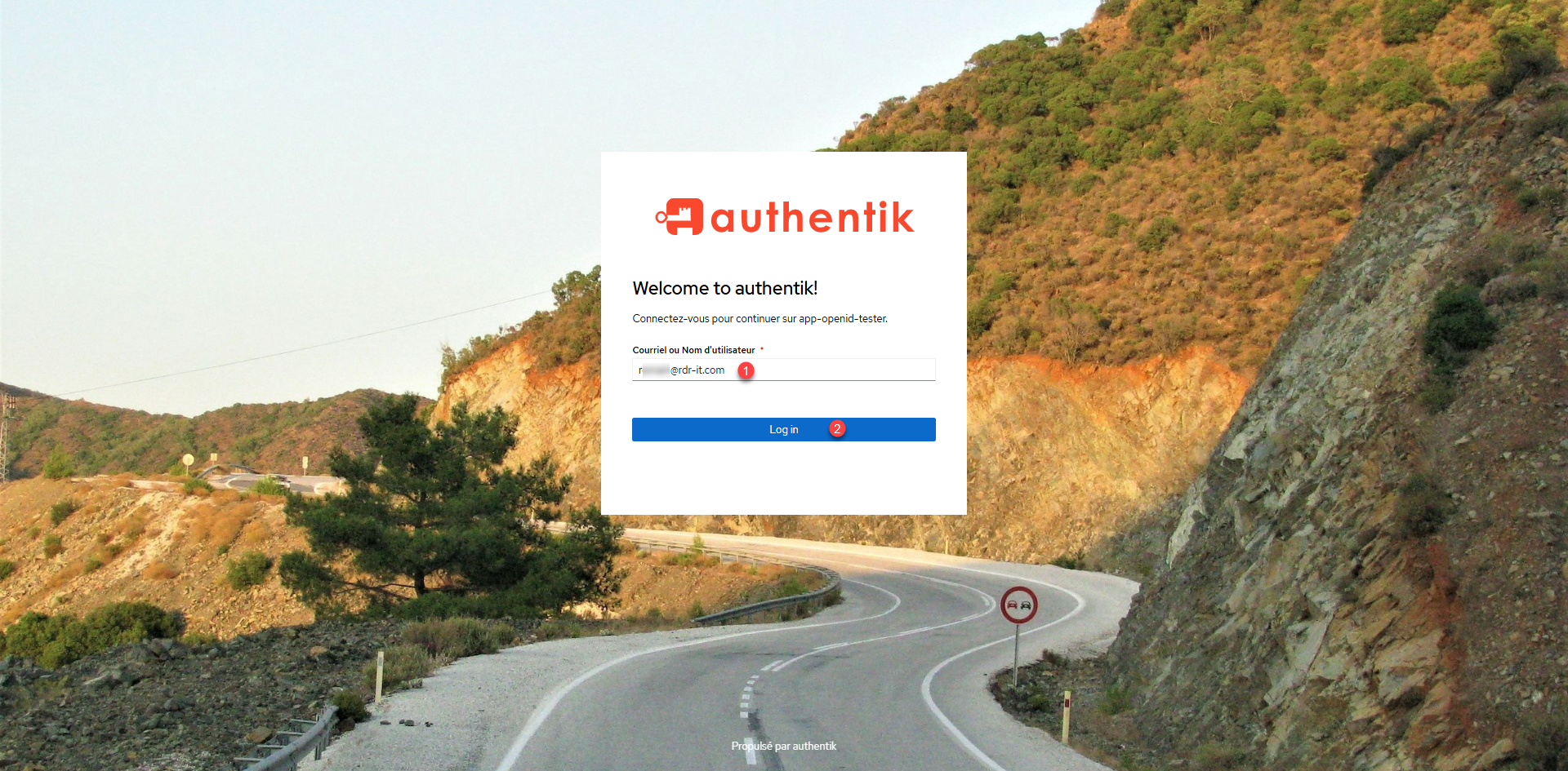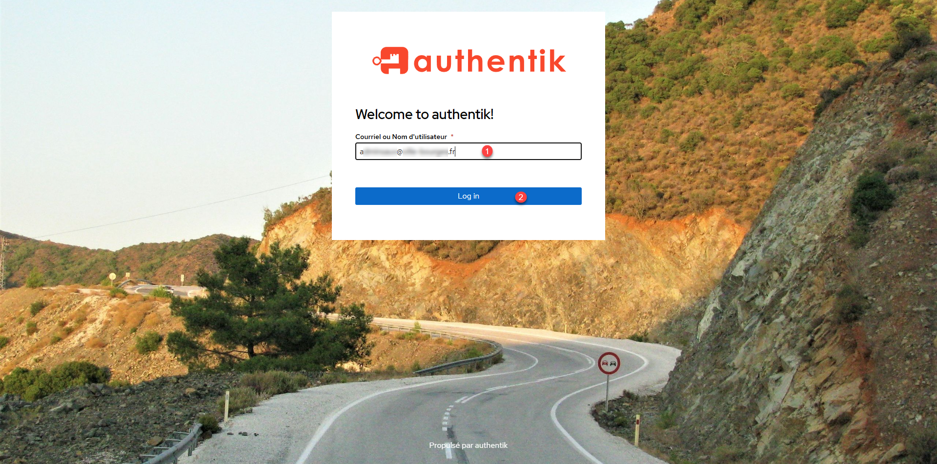 We arrive at the Authentik authentication page, I will enter the 1> email address of the user that was created and click the Log in 1> button.