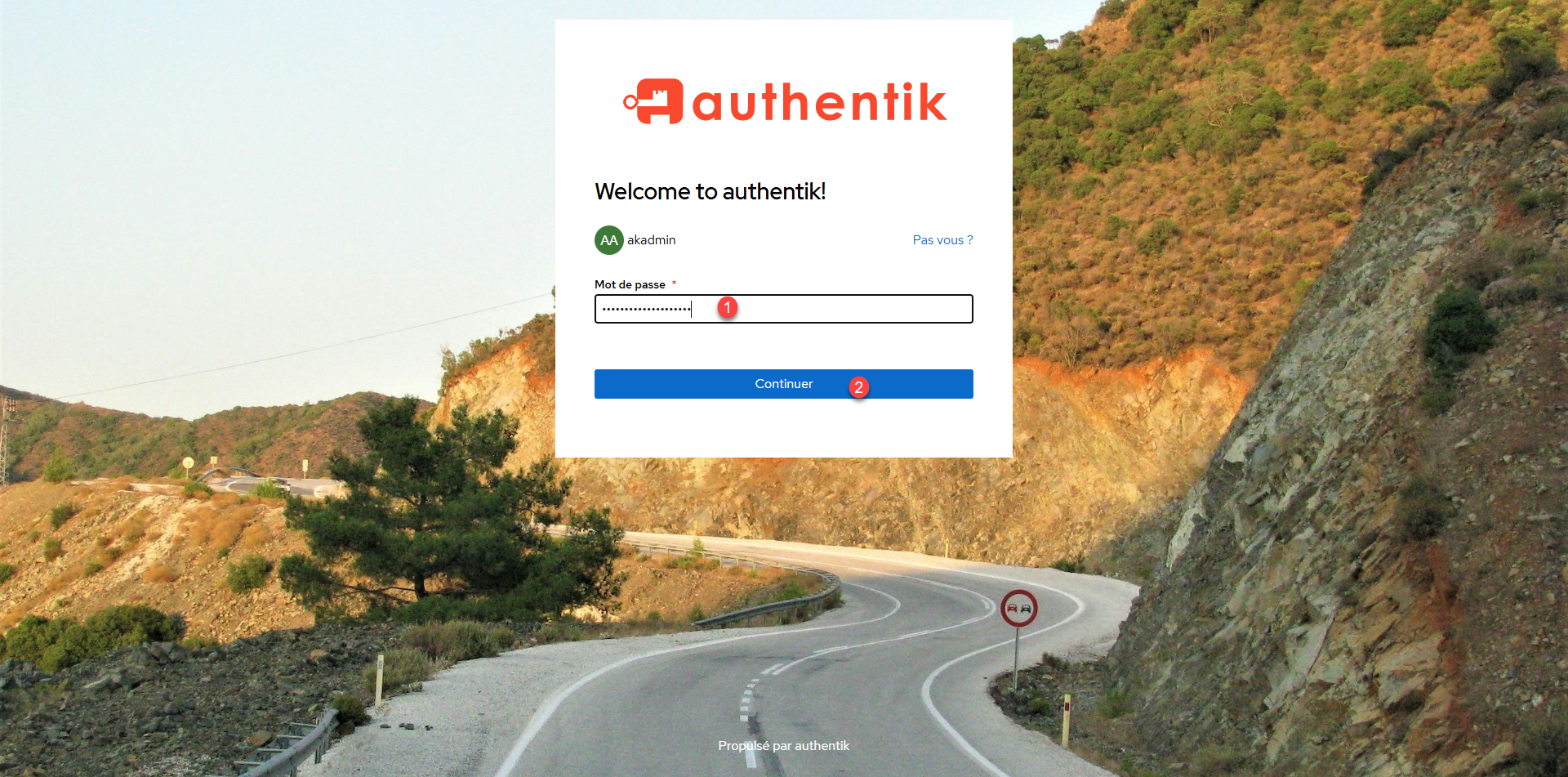 Before going to the configuration, we will test the proper functioning of Authentik, from an Internet browser as an address enter the IP address of your Docker server in HTTPS on the port defined in the file .env. Pass the certificate error, you should arrive on the authentication form, enter the email address 1 of the account akadmin and click on the Log in 2> button.