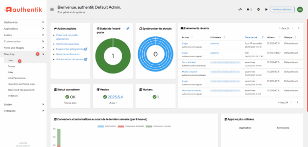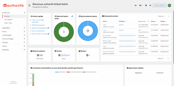 Its main advantage lies in its flexibility: it supports modern standards such as OAuth2, OpenID Connect, SAML, LDAP and TOTP, which allows smooth integration with most common applications. Authentik can thus play the role of a secure identity provider (IdP) or reverse proxy.
