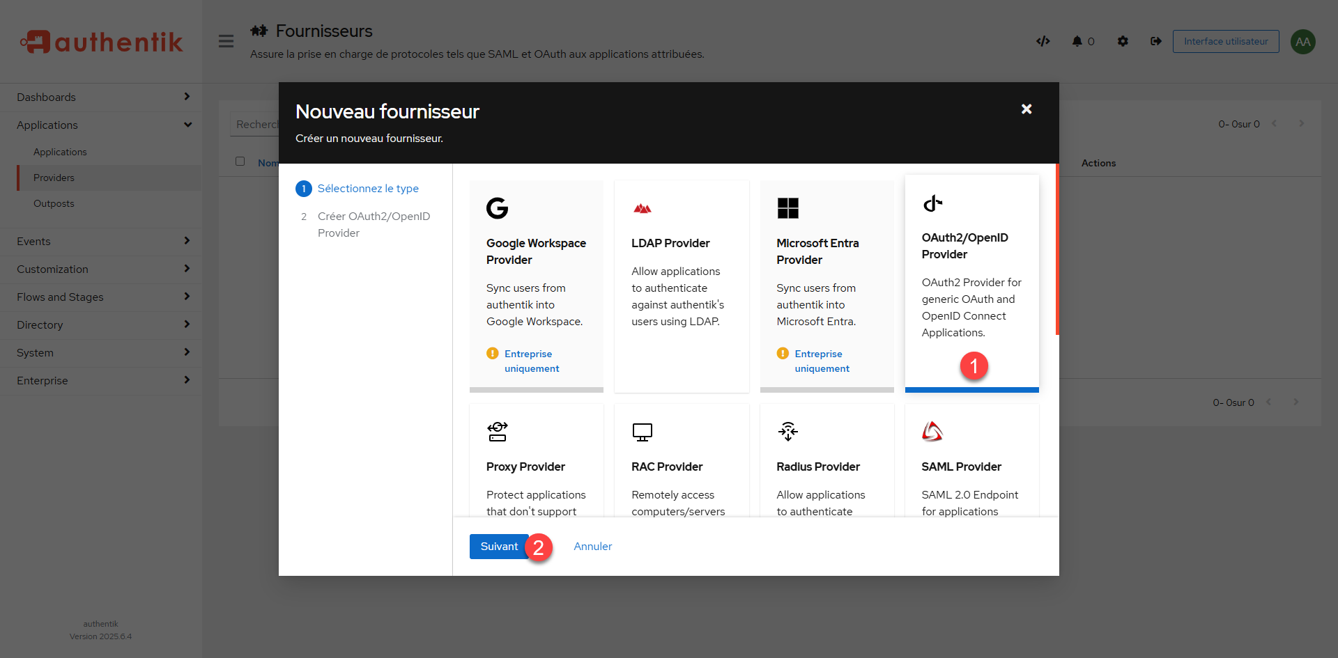 To start, you have to choose the type of provider you want to configure, in this tutorial we will create an OpenID provider, click OAuth2/OpenID Provider 1 to select it and click the Next button 2.