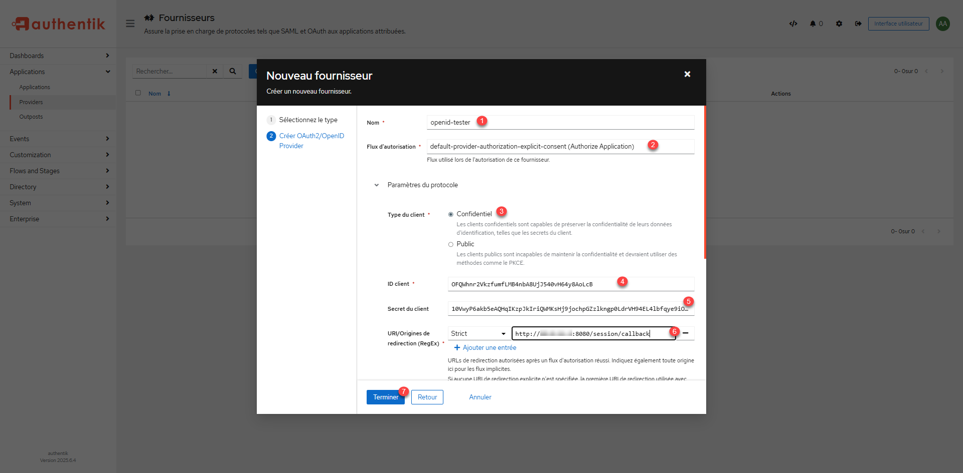 We will pass the provider configuration, start naming it 1, then select the authorization stream* 2, client type choose Confidential 3>, in a note block copy the Client ID 4> and Client Secret 5>, then specify the Callback URL 6 and click Finish 7> to create the provider.