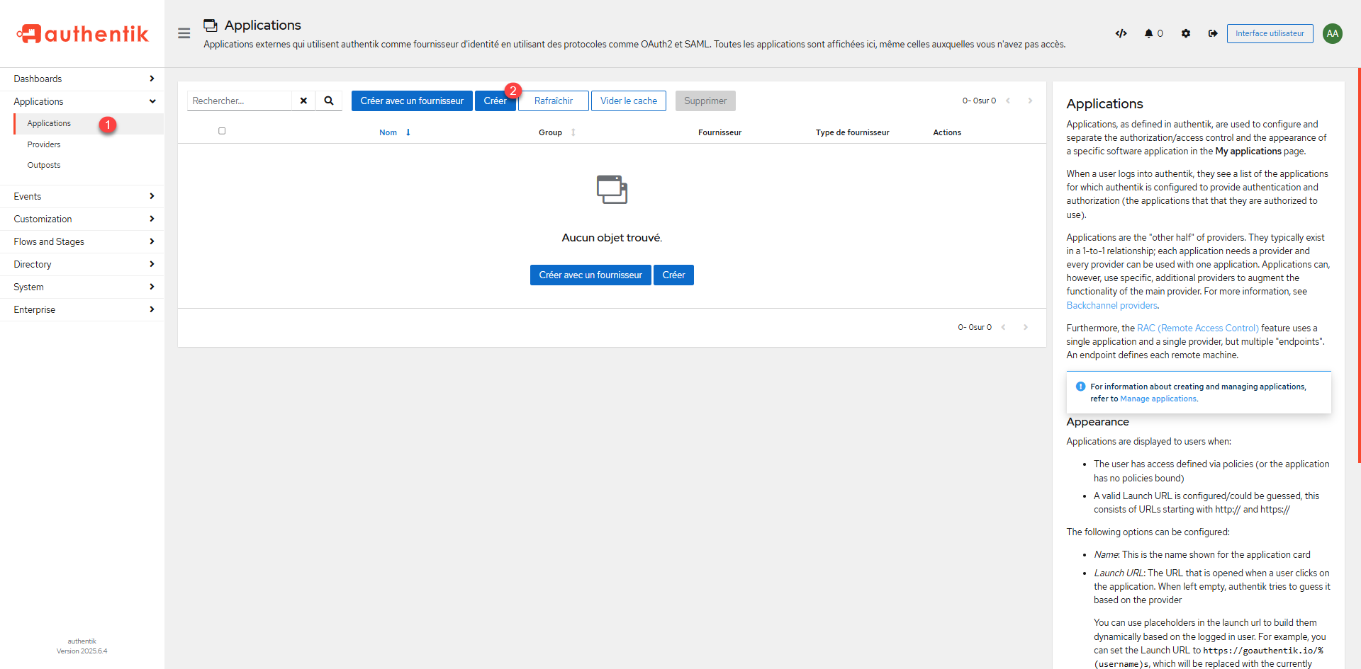 We will go to the creation of the app, from the navigation menu, click on Applications 1> and then on the page that lists it, click on Create 2>.
