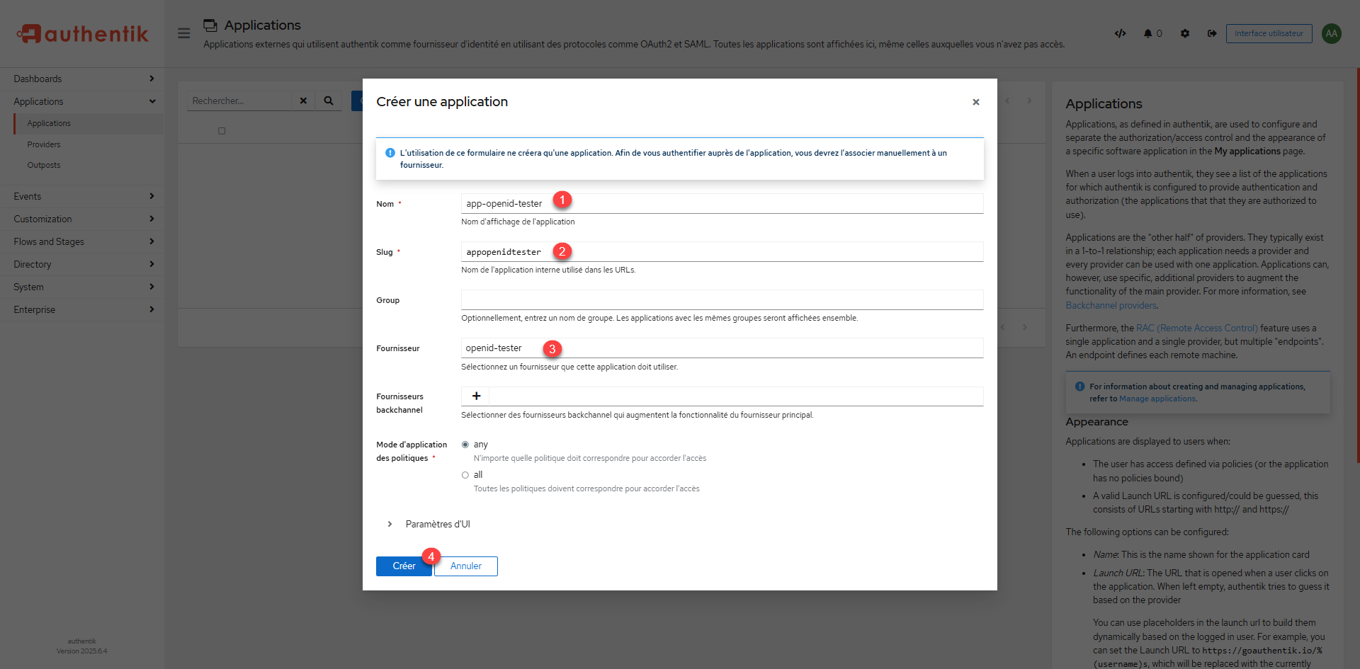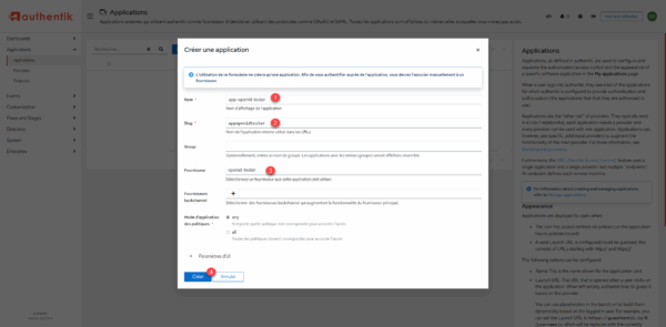 Enter the name of the 1> application and then the slug 2>, select the 3> provider created and click the Create 4> button.