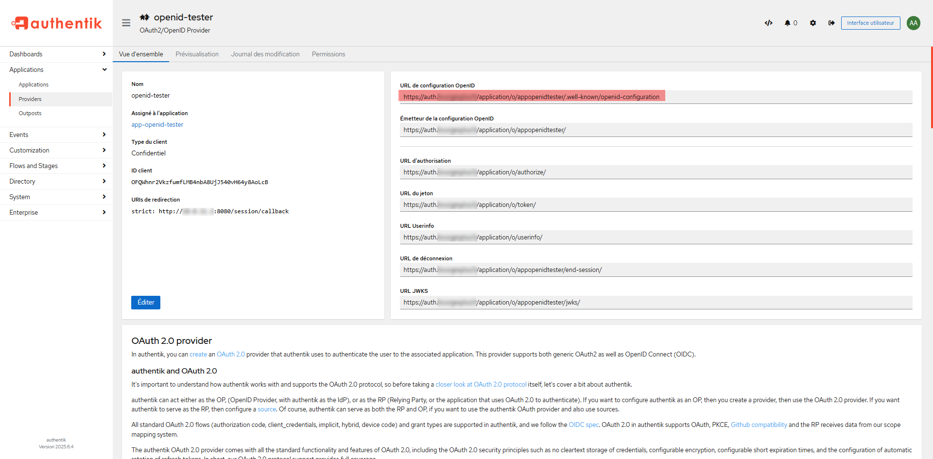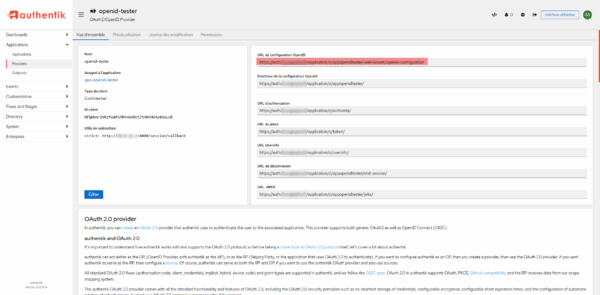 On the right side, you have the different URLs that may be required for the application configuration, for Openid-Tester, I will copy: OpenID configuration URL.