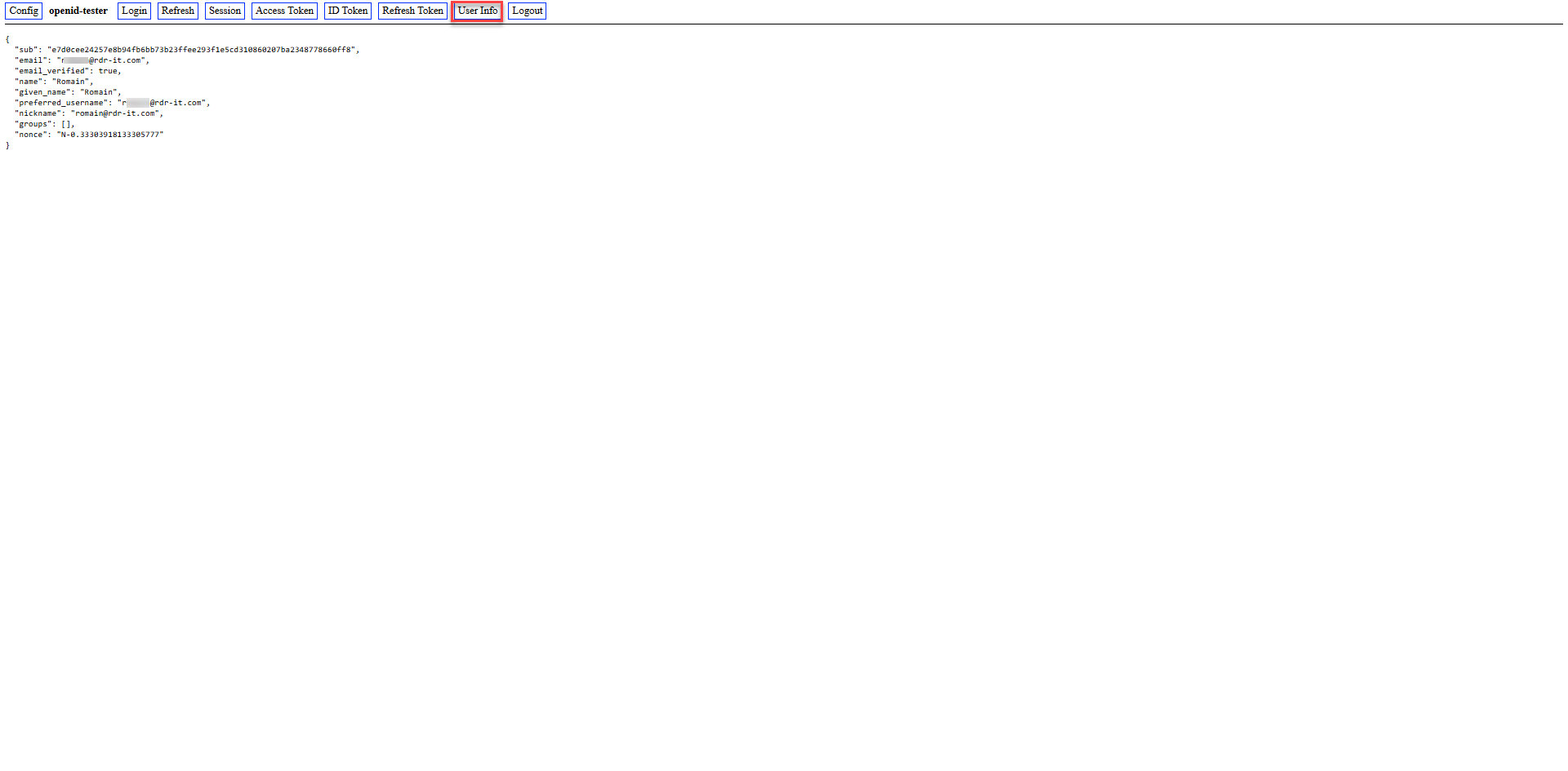In the application, you can see this time that the user information has passed to Openid-Tester.