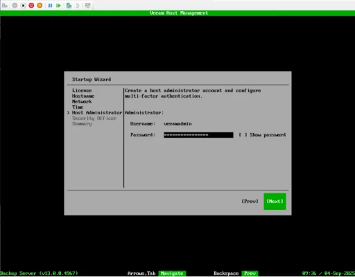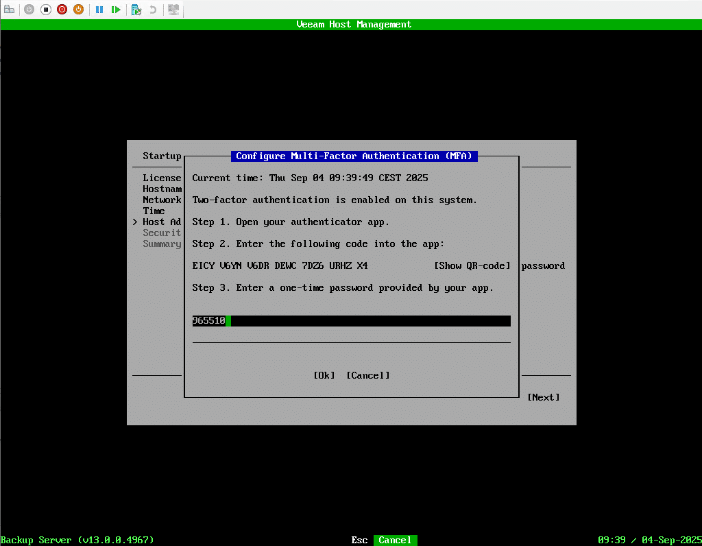 We continue with the configuration of the veeamadmin account, where we must configure the password and the TOTP code.