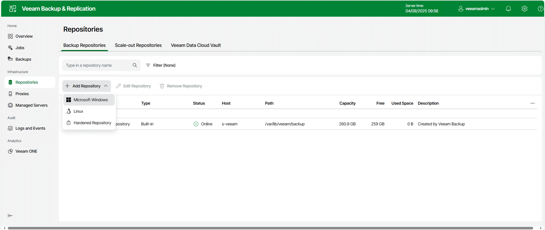 At the time of writing this tutorial, the Veeam 13 web administration interface does not yet integrate all the features, as can be seen in the screenshot below, you cannot add an SMB repository for example.