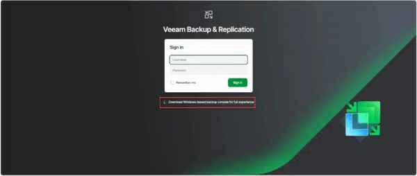 From a Windows server, go to the Veeam 13 web console login page and click Download Windows-based backup console for full experience.