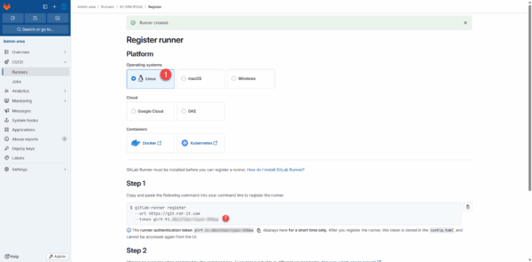 Sélectionner l’OS (Linux) 1, dans la section Step, copier le token 2.