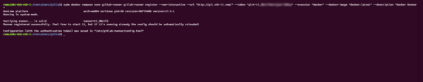 sudo docker compose exec gitlab-runner gitlab-runner register --non-interactive --url "https://git.domain.tld/" --token "glrt-t1_XXXXXXXXXXXXX" --executor "docker" --docker-image "docker:latest" --description "Docker Runner"Ici on configure le runner en indiquant, l’URL du Gitlab, le Token et le type, ici un Docker qui va nous permettre de construire des images depuis un Dockerfile par exemple.