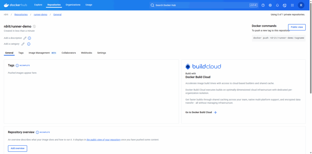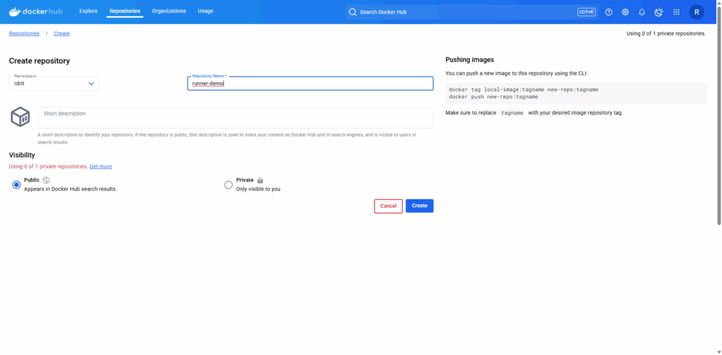 Pour commencer, j’ai créé un dépôt (repository) runner-demo depuis mon espace sur dockerhub.