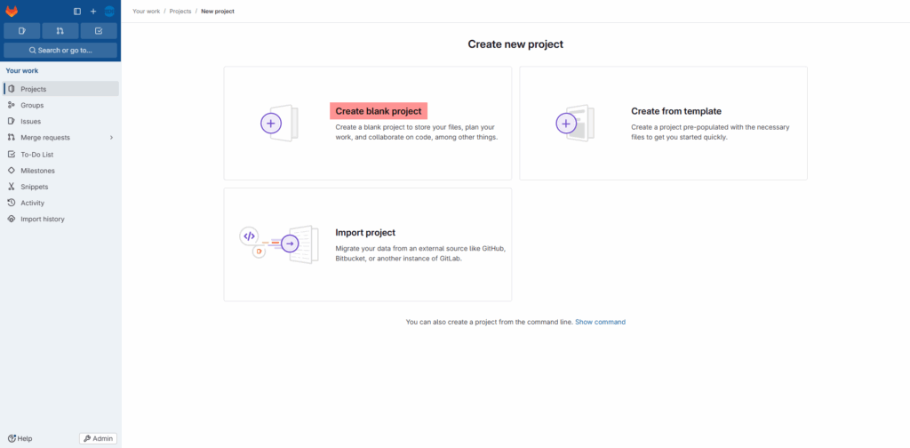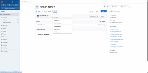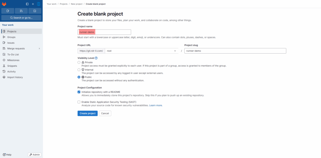 Sur Gitlab, je vais également créer un Projet que je vais nommer : runner-demo.