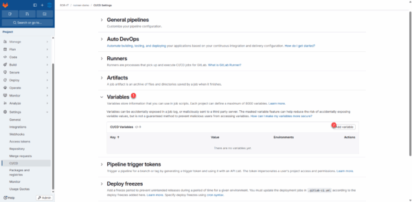 Dans le menu, aller sur CI/CD 1 et cliquer sur Runners 2.