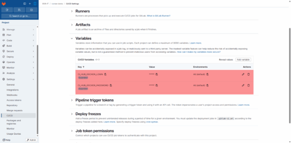 Dans notre pipeline qui va être l’exécution automatique, on va souhaiter envoyer l’image générée sur un registry (dépôt), pour utiliser la commande docker push, il est souvent nécessaire d’être authentifié, pour éviter d’avoir à écrire identifiant et mot de passe en clair de le fichier de configuration de l’action automatique, on va ajouter ceci dans des variables au niveau du projet.