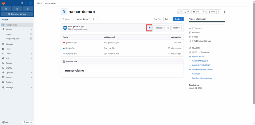 Pour déclencher le pipeline, il vous suffit de modifier le fichier Dockerfile et de commit le fichier.