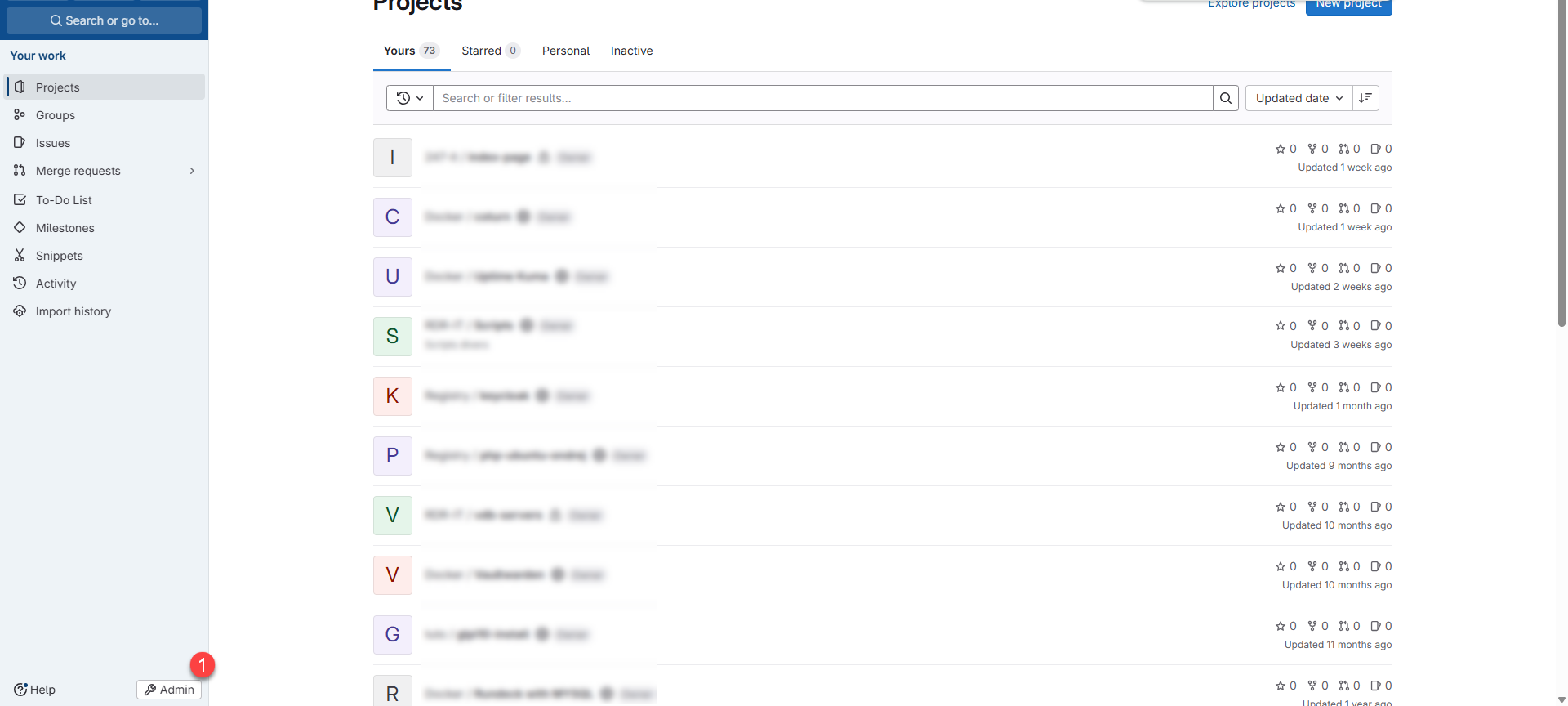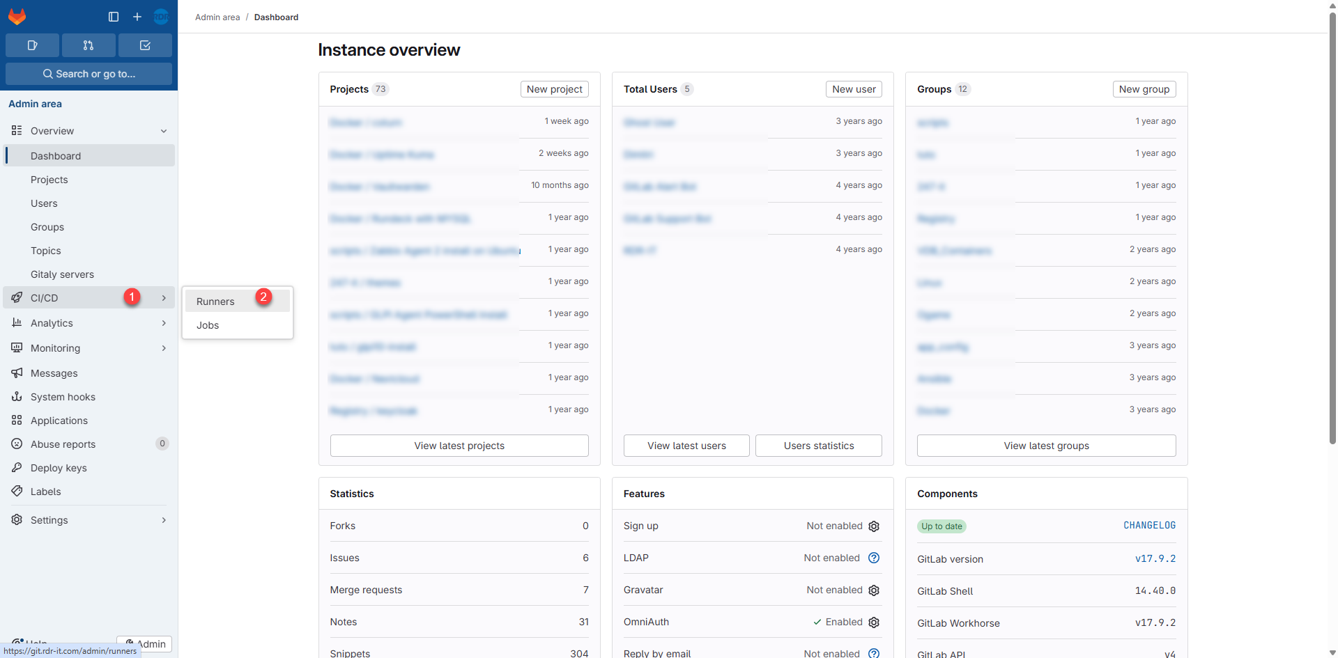 Depuis l’interface Web de Gitlab, cliquer sur Admin 1.
