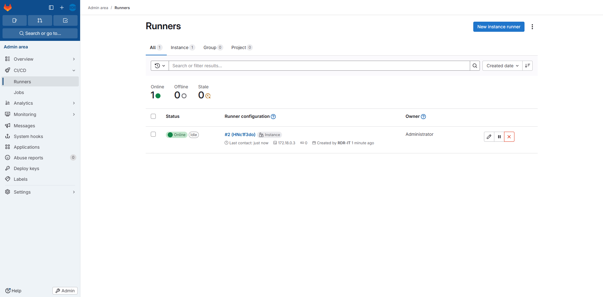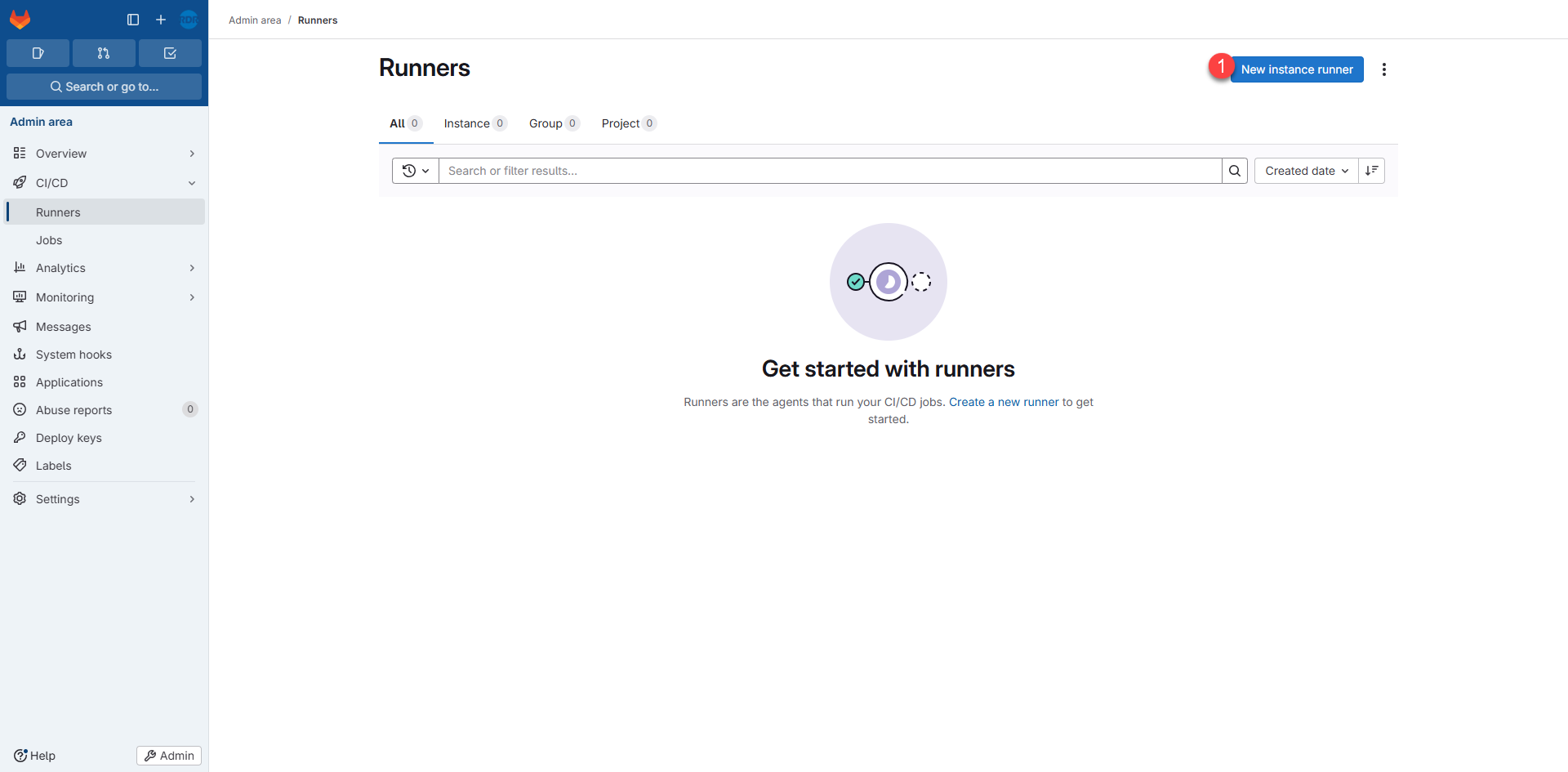 On arrive sur la liste des Runners configurés, celle-ci est vide pour le moment, cliquer sur le bouton New instance runner 1.