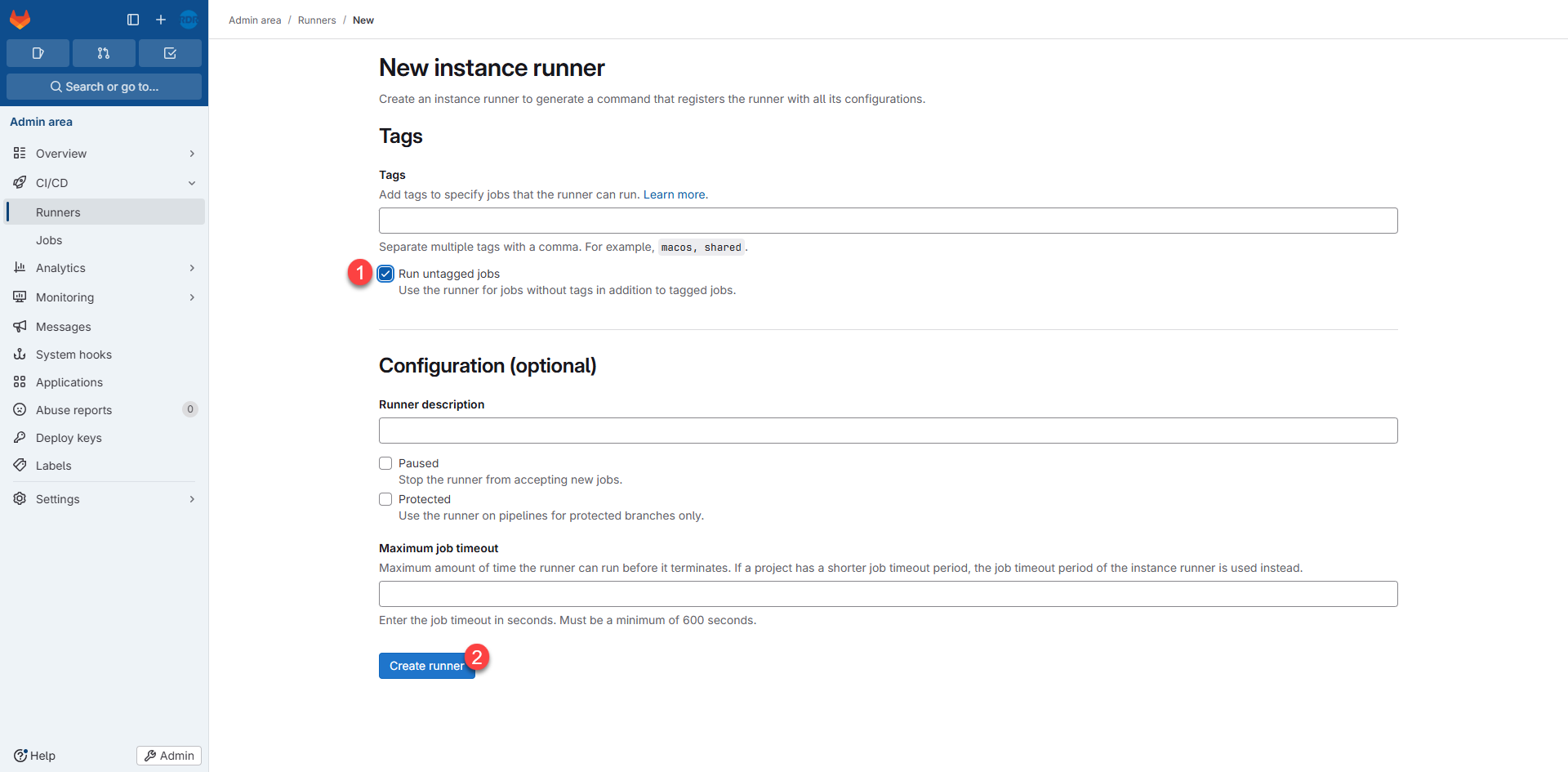 Cocher la case : Run untagged jobs 1 puis cliquer sur le bouton Create runner 2.