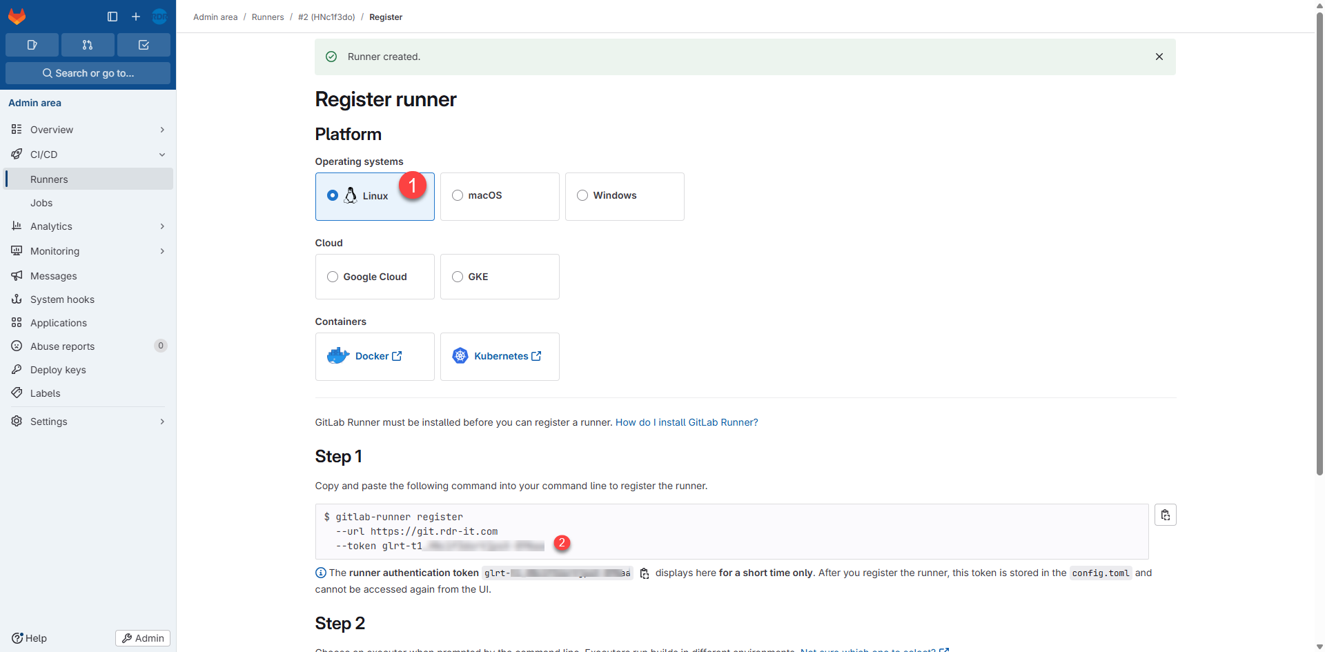 Sélectionner l’OS (Linux) 1, dans la section Step, copier le token 2.