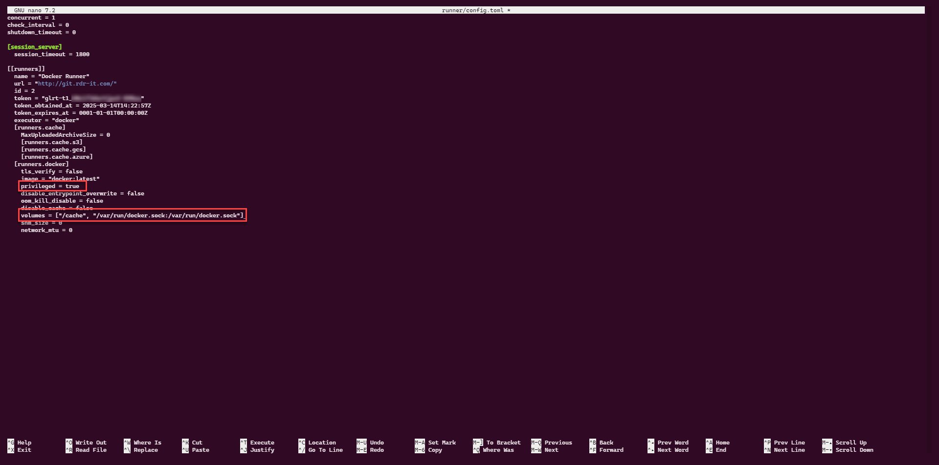 sudo nano runner/config.tomlPasser le paramètre privileged à true et dans volumes, ajouter l’accès au socket docker /var/run/docker.sock:/var/run/docker.sock.