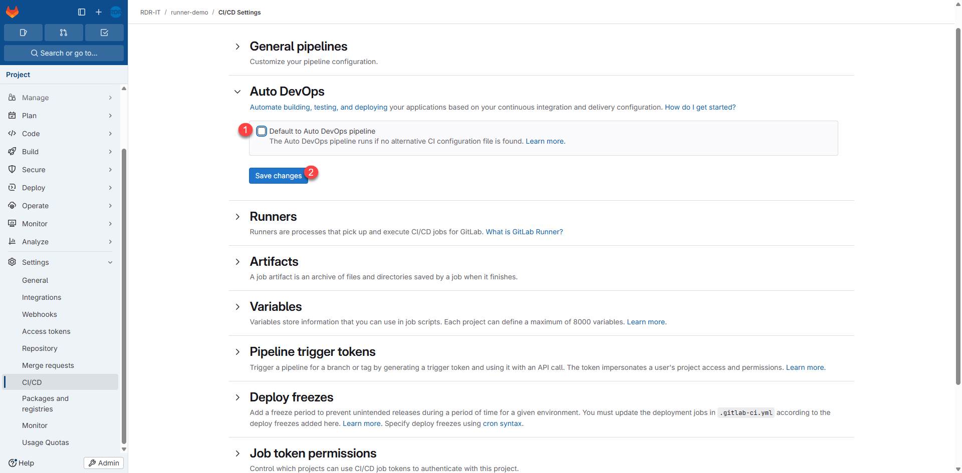 Décocher la case Default to Auto DevOps pipeline 1 et cliquer sur Save Changes 2.