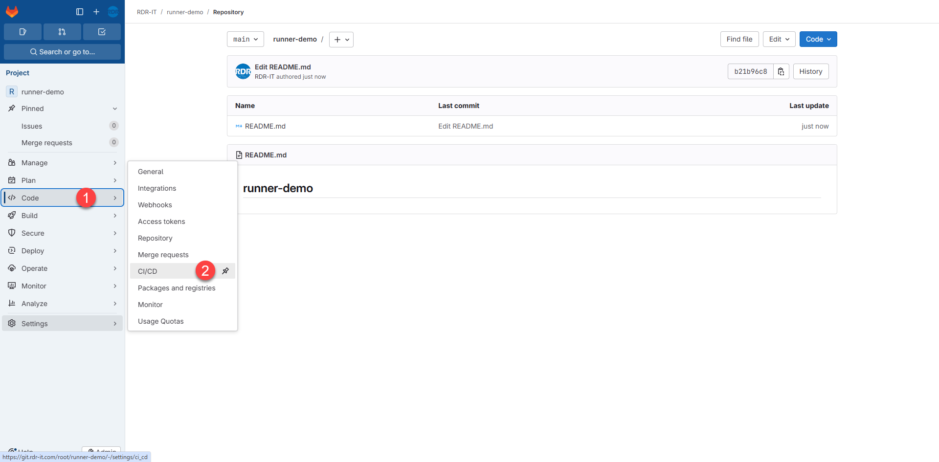 Dans le projet, cliquer sur Code 1 puis CI/CD 2.