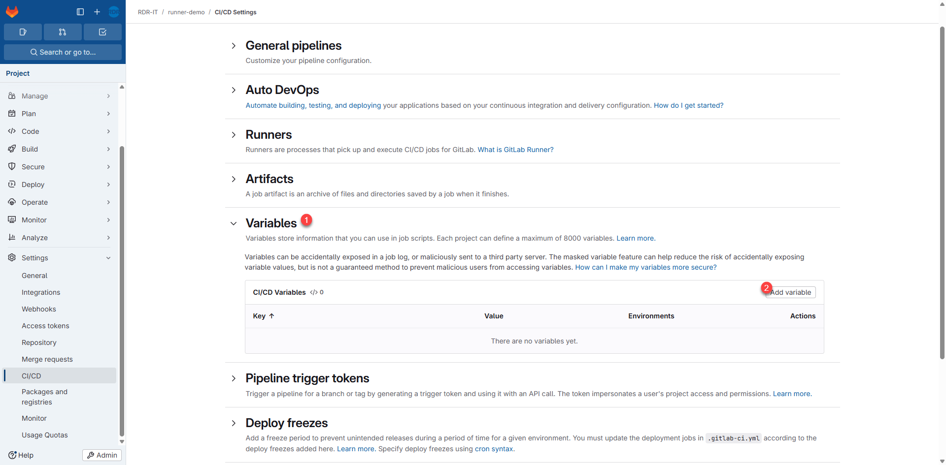 Dans le menu, aller sur CI/CD 1 et cliquer sur Runners 2.