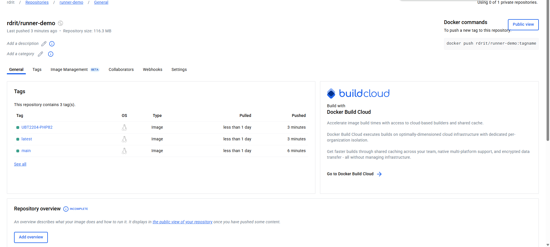 Pour commencer, j’ai créé un dépôt (repository) runner-demo depuis mon espace sur dockerhub.