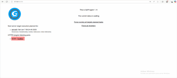 Depuis un navigateur Internet, aller sur l’interface Web de GLPI Agent, si vous avez un interface graphique un navigateur http://127.0.0.1:62354 sinon depuis un ordinateur distance http://A.B.C.D:62354