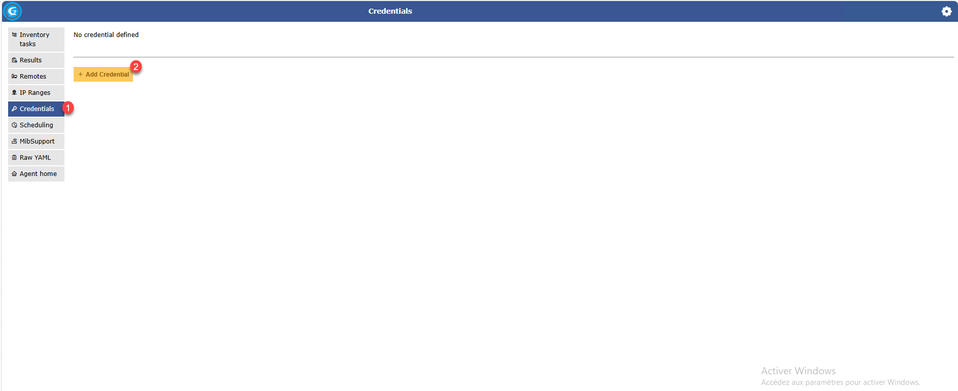 Depuis le menu, cliquer sur Credentials 1 pour accéder à la liste et cliquer sur le bouton Add Credential 2.