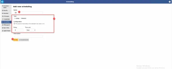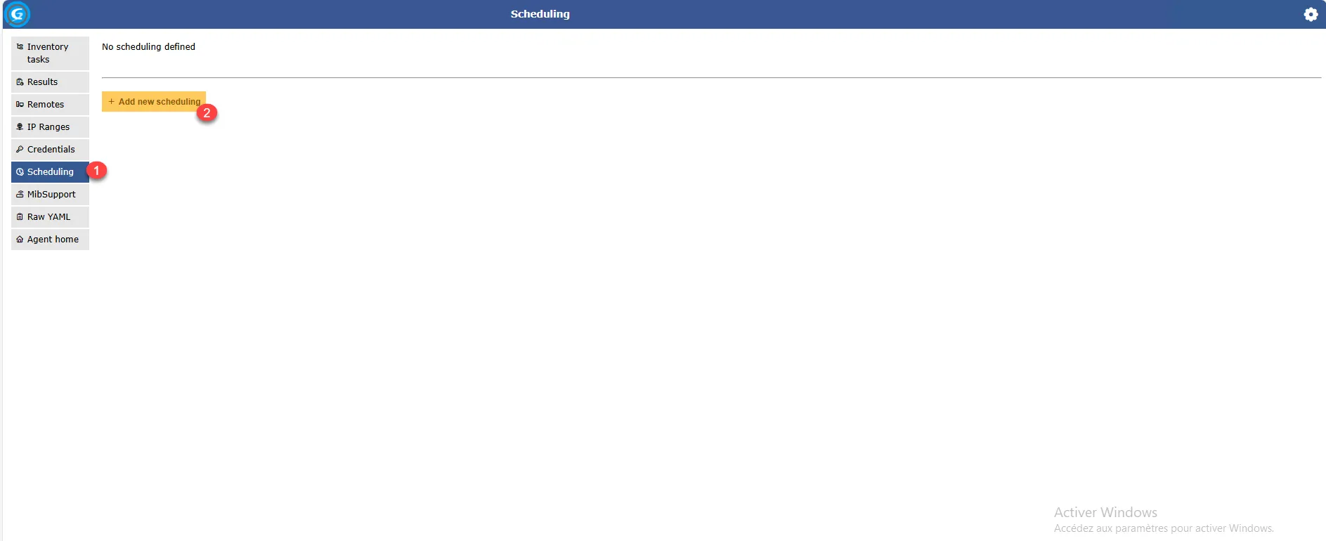 Cliquer sur Scheduling 1 dans le menu puis sur la page Add new scheduling 2.