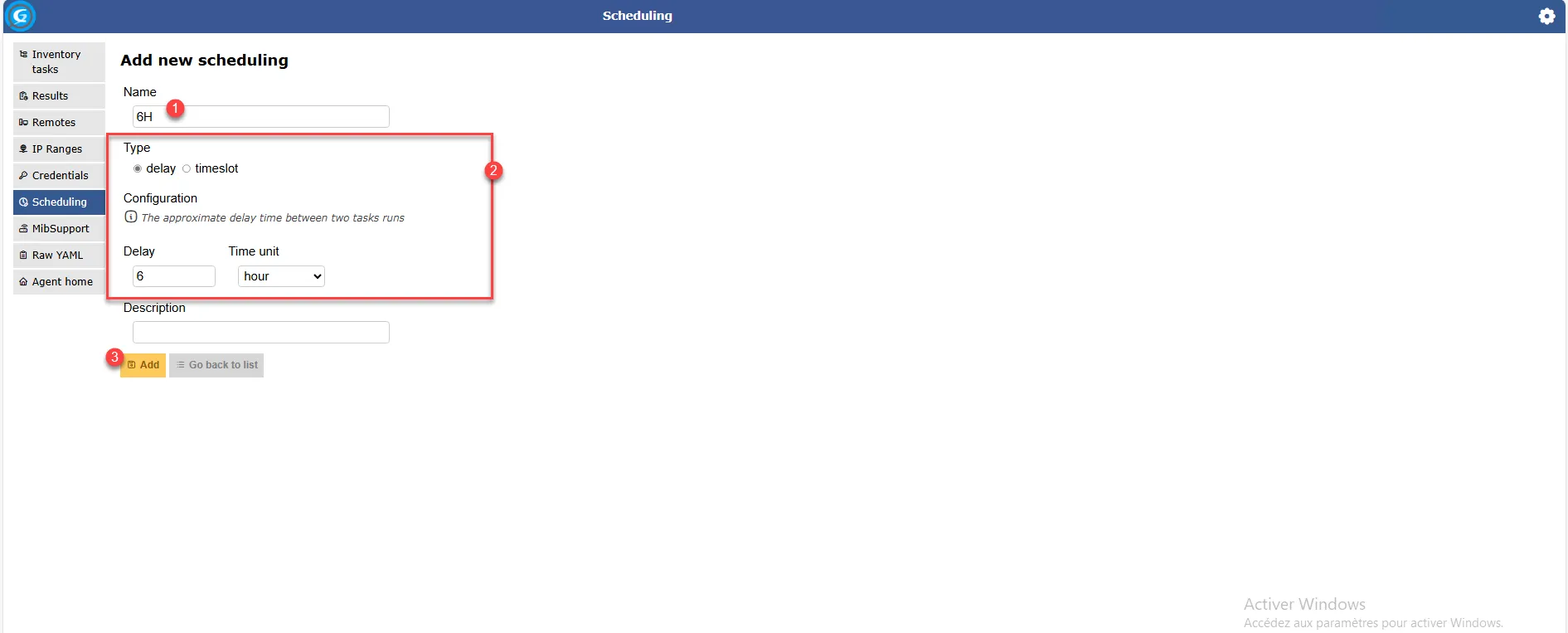Commencer par nommer 1 la planification, configurer la planification 2 et cliquer sur Add 3 pour l’ajouter à la configuration.