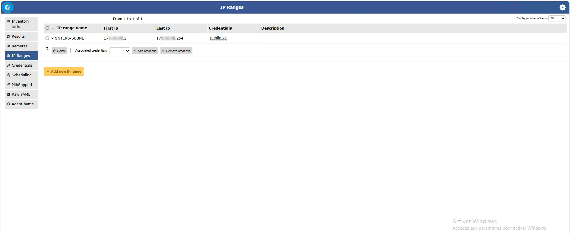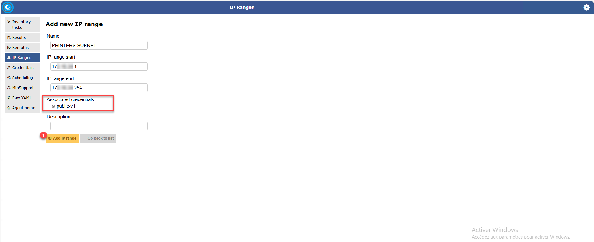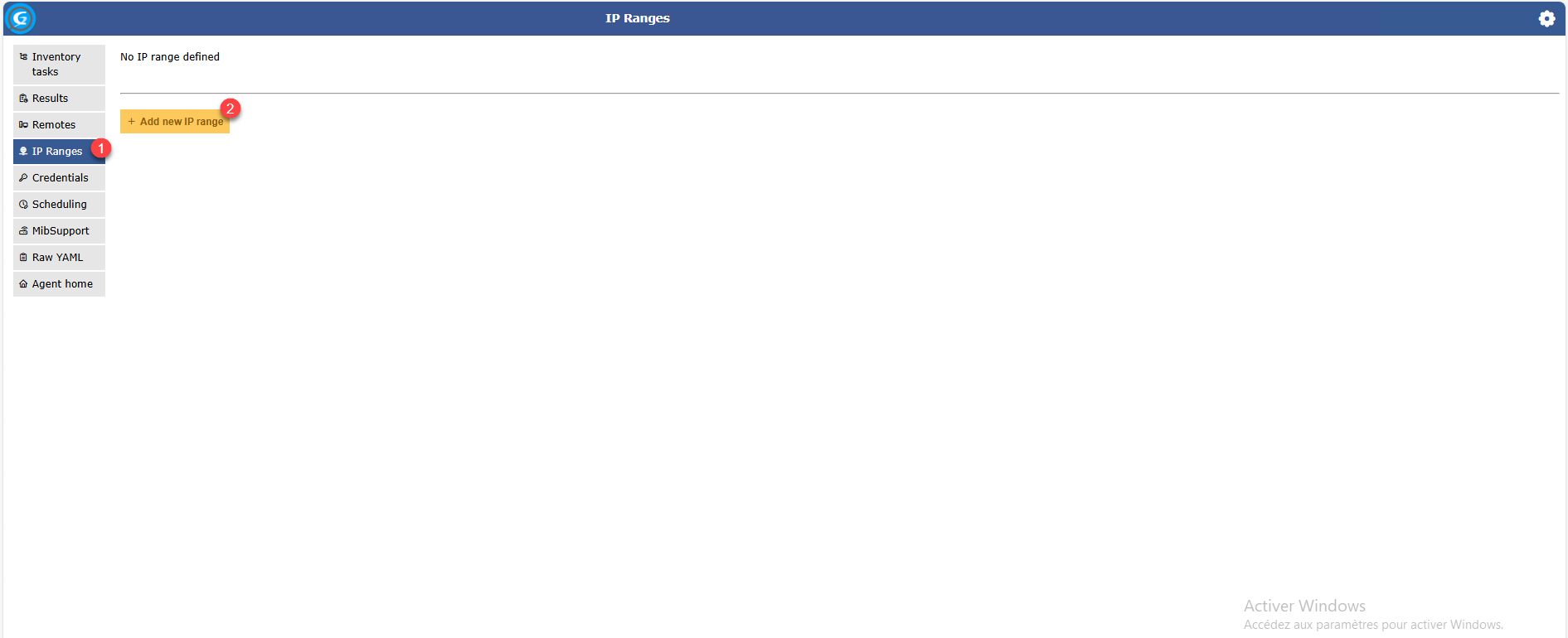 Maintenant, on va configurer une ou plusieurs plages d’adresse IP qui sera utilisée pour découvrir les équipements réseau, depuis le menu cliquer sur IP Ranges 1 puis sur le bouton Add New IP Range 2.