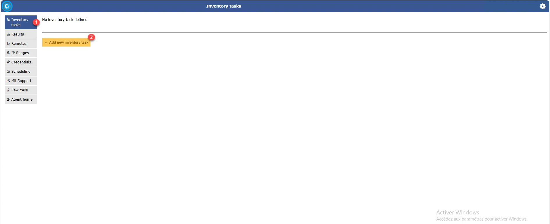 Cliquer sur Inventory Tasks 1 dans le menu puis sur le bouton Add new inventory task 2.