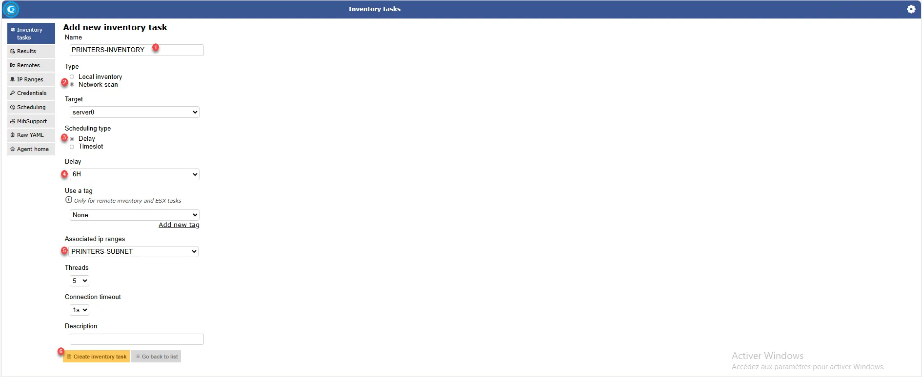 Nommer la tâche d’inventaire 1, choisir le type Network scan 2, la target correspond au serveur GLPI, choisir le type de planification 3 puis sélectionner la planification 4, pour finir sélectionner la plage IP 5. En complément vous pouvez ajuster le nombre de Threads qui correspond au nombre de processus utilisés, plus ce nombre est élevé, plus la consommation CPU sera importante mais l’inventaire sera rapide. Pour finir cliquer sur le bouton Create inventory task 6.