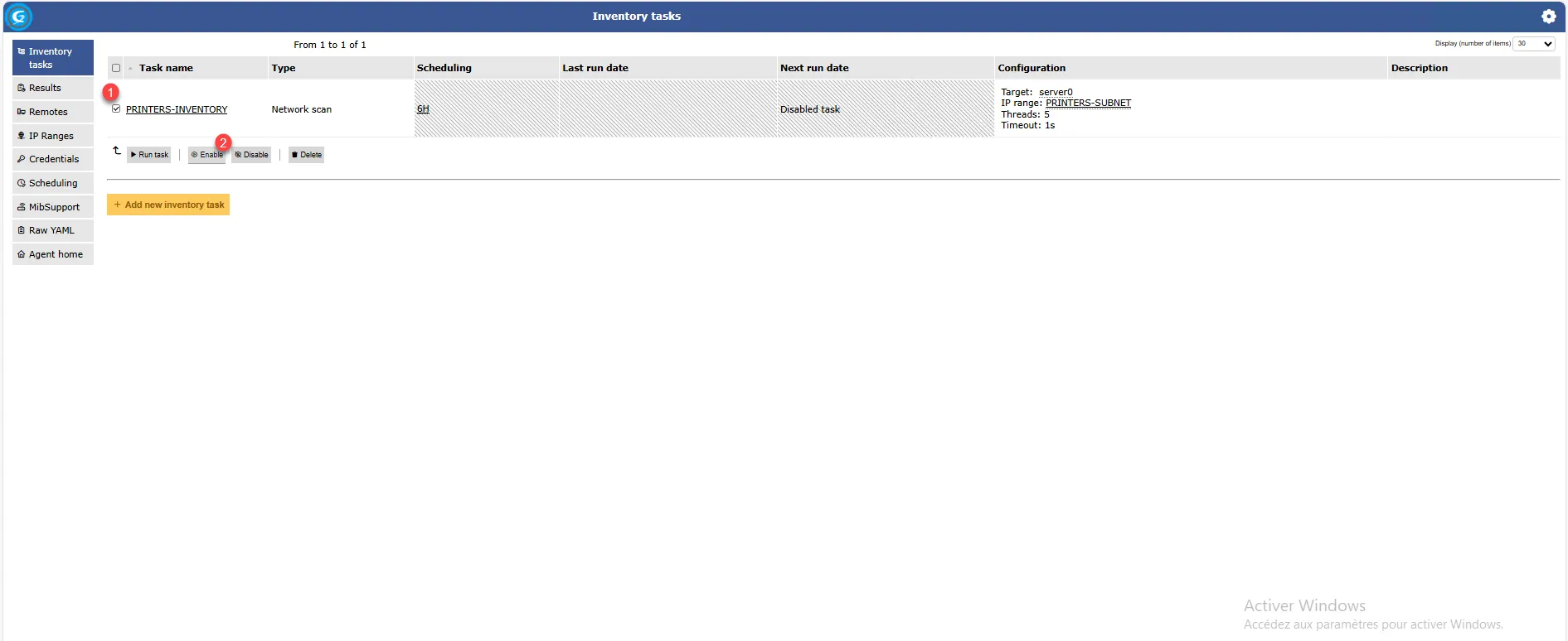La tâche est ajoutée, par défaut elle n’est pas active, sélectionner la tâche 1 et cliquer sur le bouton Enable 2.