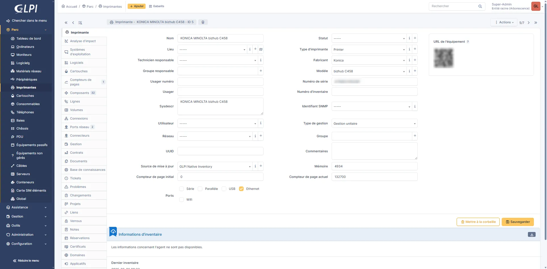 Les informations du copieur sont remontés (Modèle, fabriquant, …) et dans la source de mise à jour, on peut voir GLPI Native Inventory.